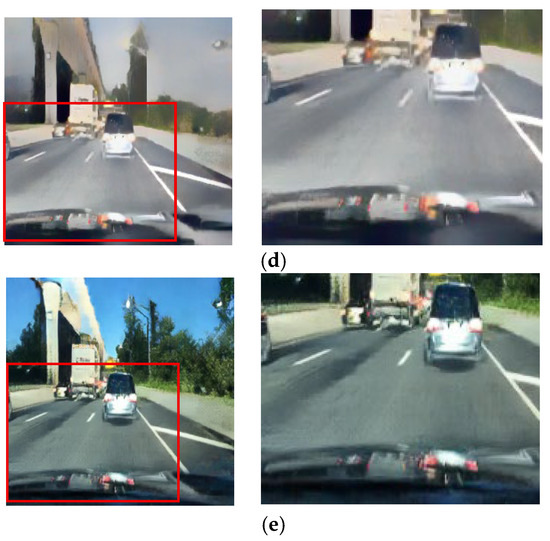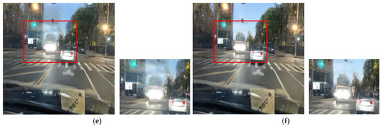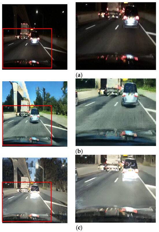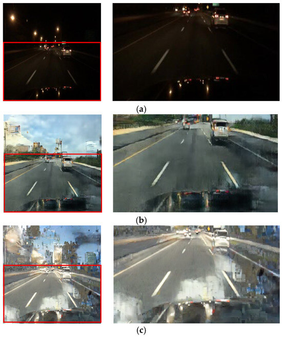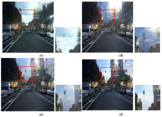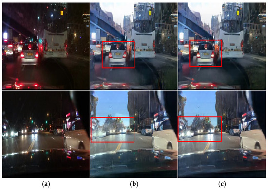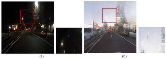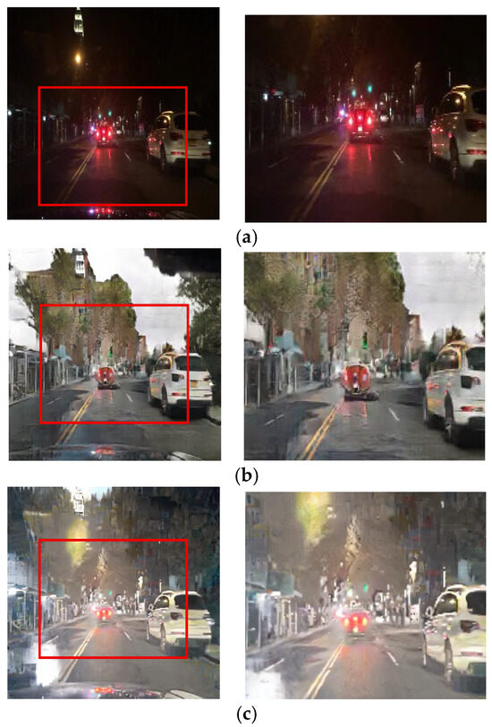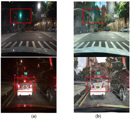The CycleGAN method was initially designed for unpaired image translation. However, this study employs a paired training strategy to preserve local lighting details during night-to-day translation, as unpaired training often fails to maintain critical object information essential for driving environments. Figure 4 depicts the daytime images converted via the unpaired and paired CycleGANs, respectively. Figure 4b presents the result of training with the unpaired CycleGAN, highlighting artifacts such as distortions in traffic light and vehicle taillight colors. In contrast, the daytime images converted using the paired training module display better transformation of the traffic lights and preserve vital road information, demonstrating that the paired training module outperforms the unpaired training module in terms of traffic light representation. In this paper, the paired CycleGAN module is applied complementarily to the unpaired CycleGAN module to preserve the object details in the input images.