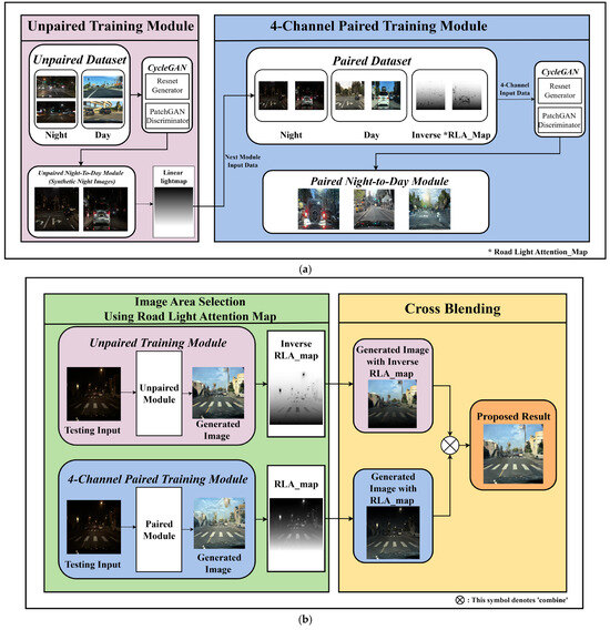 The first CycleGAN module focuses on unpaired training to generate daytime images, which effectively support night-to-day translation. However, the detailed object information that must be recognized in real driving scenarios may be lost. An additional paired training CycleGAN module, based on four-channel input, is designed to address this problem. This module was created by augmenting data and adding a light information channel. The upper area of the daytime images (generated by the unpaired training module) and the lower area of the daytime images (converted via the paired training module) were selectively blended using the RLA map to preserve road details while effectively performing nighttime-to-daytime image translation. Section 3.2 and Section 3.3 provide further details on the night-to-day image conversion training process and the image area selection and cross-blending process, respectively.