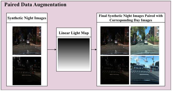 where denotes the linear light map function, represents the vertical coordinate in the image, and denotes the total height of the image. As increases from 0 to , increases linearly from the average intensity value () of the image to 255. After applying the function to ensure that the value does not exceed 255, the value is normalized by dividing it by 255, resulting in a value between 0 and 1. Algorithm 1 illustrates the data augmentation process, including creating the TodayGAN light map in the unpaired training module.