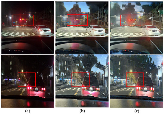 Input (night images) and resulting images highlighting light conversion errors: (a) input images, (b) three-channel paired training images, and (c) four-channel paired training images.