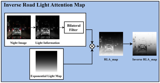 The proposed inverse RLA map can be generated by processing the light information extracted from the input nighttime image using a bilateral filter, followed by applying an exponential light map. Unlike the linear light map in the unpaired training module, the exponential function enables the construction of a steep gradient map. By applying the exponential function, the paired training module can select critical areas to focus on via four-channel training. In addition, applying the inverse to the generated RLA map and darkening the traffic light and taillight areas enhance the training of these regions. Equation (6) mathematically represents the process of generating the inverse RLA map: