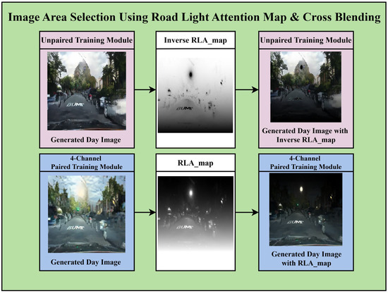 Based on the RLA map, the unpaired training module performs well in transforming the upper region, and the paired training module excels in the lower region. Applying these complementary characteristics, a cross-blending process is performed to integrate the results of the two modules into a single image. In this process, the RLA map and its inverse are employed as maps to select specific regions from the two daytime image results. In the daytime image generated by unpaired training, the inverse of the attention map is applied to extract the upper region, whereas in the paired training result, the attention map is applied as-is to select the lower region. The selected portions from both images are fused based on the maps. Cross-blending is an effective approach that simultaneously reflects the advantages of both CycleGAN modules via simple masking and selective merging, without the need for complex operations. The overall visual quality of the resulting image can be significantly enhanced by integrating the natural colors of the sky and distant backgrounds provided by the unpaired module with the precise details of roads, vehicles, and traffic lights preserved by the paired module.