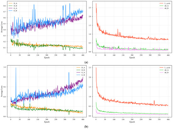 Figure 10 plots the training loss curves, which confirm the stable convergence of both our modules. For each module, the content preservation losses (cycle-consistency and identity) steadily decrease and then stabilize, proving that the generators learned to maintain the image’s core structure and color. At the same time, the adversarial losses reached a stable equilibrium, indicating a healthy training dynamic free from mode collapse.