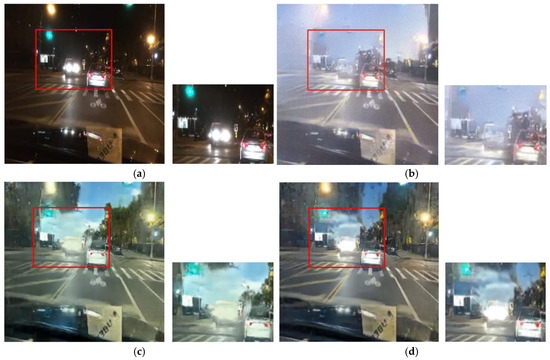 In contrast, the results from the proposed method in Figure 8 demonstrate that the saturation of vehicle lights is enhanced, and the light spreading effect is minimized. The first row in Figure 8 indicates that the traffic light colors are preserved, and the saturation of the vehicle stop light increased in the four-channel paired training. The spreading and blurring of light around the vehicle lights is significantly reduced in the second row.