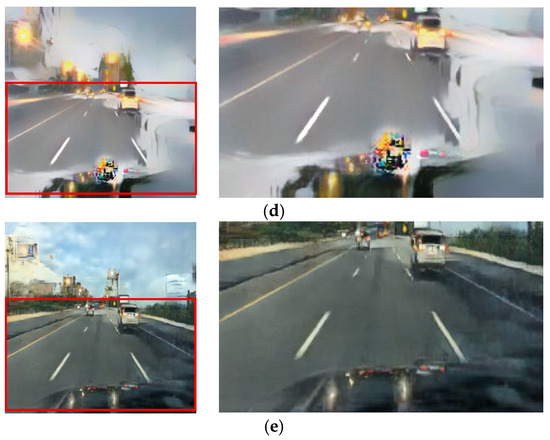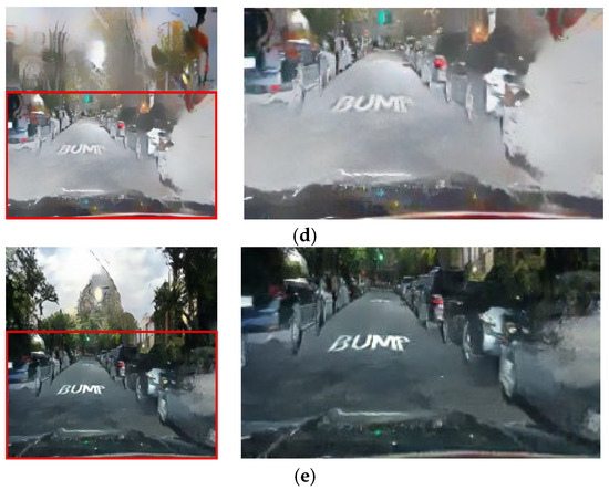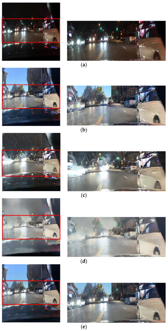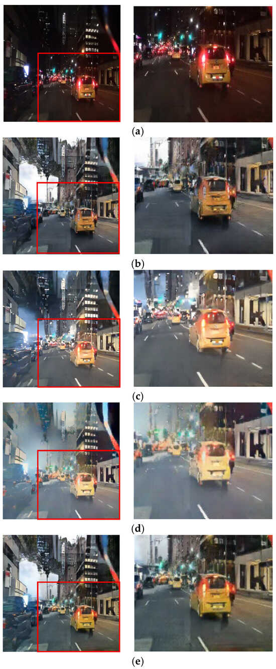Input and resulting images: (a) input image, (b) paired CycleGAN, (c) ToDayGAN, (d) SLAT DayConv [31], and (e) proposed method.