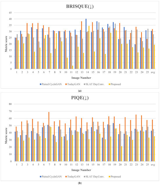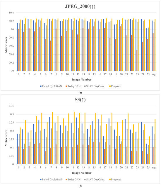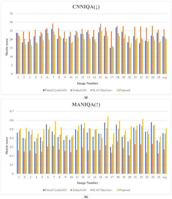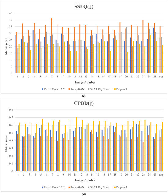 Additionally, Table 2 compares the average values for the 25 experimental images among the proposed method and existing methods, including the paired CycleGAN, ToDayGAN, and SLAT DayConv techniques [31].