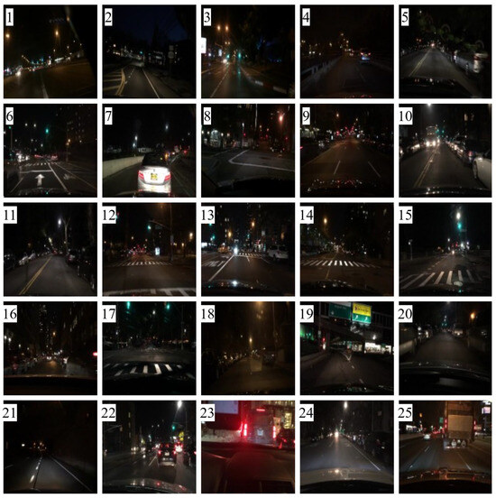 Figure 20 presents the evaluation results for 25 comparative images. Figure 21 depicts the test images used for score measurement. These images consist of nighttime driving environments where fundamental information, such as well-defined lane markings and vehicle lights, remains perceivable. The proposed method consistently ranks highly across several quality assessment metrics, demonstrating excellent robustness and minimal performance variation.