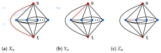 The above model—a two-terminal graph—can be applied to observe the two-terminal reliability of a network. If each edge of such a graph operates independently with the same fixed probability , the two-terminal reliability, denoted by , is the probability that there exists a path between the target vertices. Much of the work in this field focuses on identifying bounds on the coefficients of two-terminal reliability polynomials [4,5,6]. A two-terminal graph is said to be uniformly most reliable or uniformly optimal in , if for all and all H in . However, a uniformly optimal graph does not always exist [7]. The problem of graph reliability is then considered from another perspective [8] by asking whether we can find an extremely optimal graph set in which the reliability of any other graph is less than that of each graph in this set for all . We must consider the existence of a uniformly optimal graph and the determination of an extremely optimal graph set. If such a graph exists, then it is clearly the only graph contained in the corresponding extremely optimal graph set. Much similar research has been performed [9,10,11,12,13].