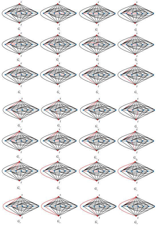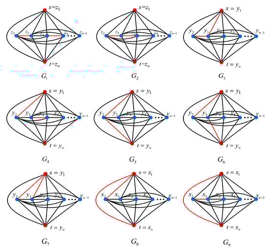 We can construct all the non-isomorphic subgraphs obtained by removing two edges from an n-order complete two-terminal graph, as shown in Figure 2. Based on the above classification, we have the following: -type graphs contain and ; -type graphs contain , , , , and ; -type graphs contain and .