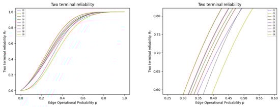 For better visualization, in Figure 5 we plot two-terminal reliabilities for the graphs in the case of .