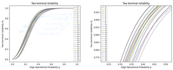 In the figure, the one on the left shows Two-terminal reliabilities for graphs in the case of ; the one on the right represents its partial enlargement of the left one.