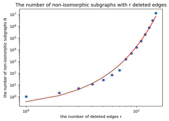 Let N be the number of non-isomorphic subgraphs of the complete two-terminal graph . We can visualize the relationship between r and N in logarithmic coordinates and fit the corresponding curves, as shown in Figure 6. Then we can see that, as the parameter r increases, the number of non-isomorphic subgraphs N grows exponentially. This work aims to reduce the search range for more reliable graphs. Then it is sufficient to count the number of a specific type of graphs, i.e., -type graphs. In the following, we apply the Pólya counting principle to count the parameter N by deleting the edges of .