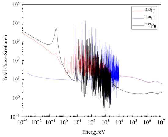 Variations in total cross-section with energy for 235U, 238U, and 239Pu.