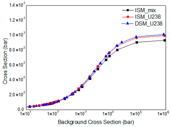 Figure 5 shows the variation law of the 238U absorption cross-section with the background cross-section in the current fuel background cross-section table. Among them, DSM refers to the absorption cross-section of 238U, a single nuclide, in the traditional subgroup parameter generation method; ISM refers to the 238U absorption cross-section considering resonance interference and the fuel-equivalent absorption cross-section in the method used in this paper. It can be seen that ISM takes the resonance interference effect into account during the generation of the background cross-section table, and the subgroup parameters generated based on this table are consistent with the actual situation of multiple resonant nuclides in the fuel. In the two resonance cross-section tables, the absorption cross-section of 238U changes with the background cross-section in the same trend. Therefore, according to this cross-section table, the subgroup parameters of each nuclide in the fuel considering resonance interference can be solved using the same numerical method as that for calculating traditional subgroup parameters in Section 2.1.