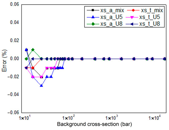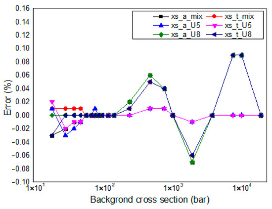 In Equation (35), cal represents the calculated value, ref represents the referenced value, x is the reaction type, r is the resonance nuclide number, k is the flat source region number, g is the energy group number, σ is the effective resonance cross-section, ϕ is the effective scalar flux, N is the nucleon number density, V is the area of the flat source region, G is the total number of energy groups, and K is the number of flat source regions in the fuel rod.