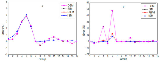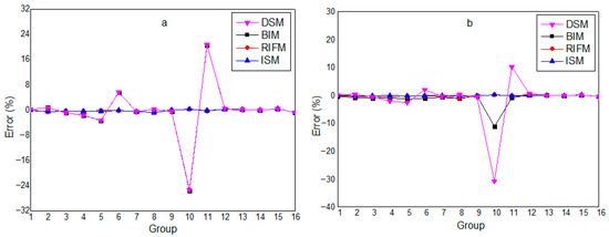 Spatial distribution of relative error for absorption reaction rate for 15th and 19th groups: (a)—15; (b)—19.