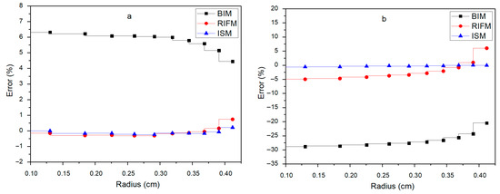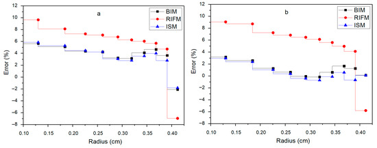 Figure 15 and Figure 16 illustrate the spatial distribution of relative errors of absorption cross-sections for the key nuclides 238U and 235U in the 15th and 19th energy groups along the radial direction of the fuel rod. For 238U in the 15th and 19th energy groups, the BIM shows relatively large errors, with the error at the outer radius reaching about 10% and 9%, respectively. The RIFM reduces the error to approximately 6% and 5% at the same positions, while the ISM further controls the error within about 6% and 0%, respectively, and the error shows a decreasing trend with the increase in radius. For 235U in the 15th and 19th energy groups, the BIM has significant errors, with the error in the 19th energy group even reaching about—30%. The RIFM improves the accuracy, with errors of about—1% and—8%, respectively, and the ISM achieves the best accuracy, with errors nearly around 0% in both energy groups. Compared with BIM and RIFM, the ISM has smaller errors in the radial distribution of fuel cross-sections. In the 15th and 19th energy groups of 238U, due to the high energy range and dense resonance peaks in these groups, the results of the BIM are relatively accurate compared to the RIFM, and the overall accuracy of ISM is better than that of BIM and RIFM. The error of ISM in the inner region comes from the inherent error of subgroup parameters, which also exists in the case of single-resonance nuclides. Therefore, the applicability of subgroup parameters in the inner region of the fuel rod needs to be improved. Among the results of 235U, the calculation accuracy of ISM is the best. Since the cross-section of 235U is strongly interfered with by 238U, the calculation error of BIM is large; compared with 238U, the calculation accuracy of RIFM for 235U is improved.