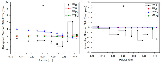 Relative error for the absorption and fission cross-sections of Pu-239 in the fuel rod: (a)—absorption; (b)—fission.