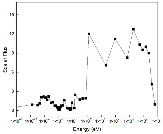 Figure 18 shows the neutron flux spectrum of the fuel region for the VERA 1A case, covering an energy range from 10−3 eV to 107 eV. In the thermal neutron region (10−3 eV–1 eV), the flux decreases slowly with increasing energy, and the ISM + SPH method accurately captures the energy distribution law of thermal neutrons. In the resonance energy range (1–10 keV), the flux shows alternating “fluctuation-plateau” characteristics, corresponding to resonance peaks. At the resonance peak positions of nuclides like 235U and 238U (e.g., the 19th energy group at 7.34 eV and the 22nd energy group at 4.45–5.04 eV), the flux presents local valleys due to resonance absorption. The depth of these valleys matches well with resonance intensity. This demonstrates the method’s accurate simulation of flux distortion caused by resonance self-shielding. In the fast neutron region (>10 keV), the flux decays rapidly with increasing energy, and the spectrum shape is smooth, indicating the method’s good stability in calculating neutron transport in non-resonance regions. The overall spectrum fully reproduces the neutron distribution law across all energy segments, verifying the method’s ability to accurately capture resonance physics processes.