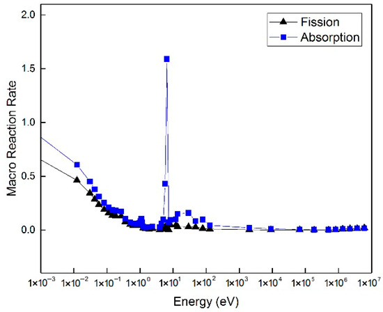 Figure 19 shows the macroscopic reaction rates (including fission and absorption reactions) in the fuel region for the VERA 1A case. The fission reaction rate curve exhibits a “peak clustering” characteristic in the resonance energy range. At the energy positions corresponding to the fission resonance peaks of 235U and 239Pu, the reaction rate rises significantly, and the peak intensity is consistent with the fission cross-section characteristics of the nuclides. In the thermal neutron region (10−3 eV–1 eV), the fission reaction rate remains at a high level, which conforms to the physical law that thermal neutrons easily induce fission. The absorption reaction rate curve shows strong peaks. These peaks are in the energy range dominated by 238U resonance capture. One example is the 19th energy group at 7.34 eV. The peak positions correspond exactly to the valley positions in the flux spectrum. This is consistent with the physical nature of resonance self-shielding. This figure demonstrates the method’s ability to accurately calculate the kinetic characteristics of different nuclear reactions and confirms its effective handling of resonance interference effects.