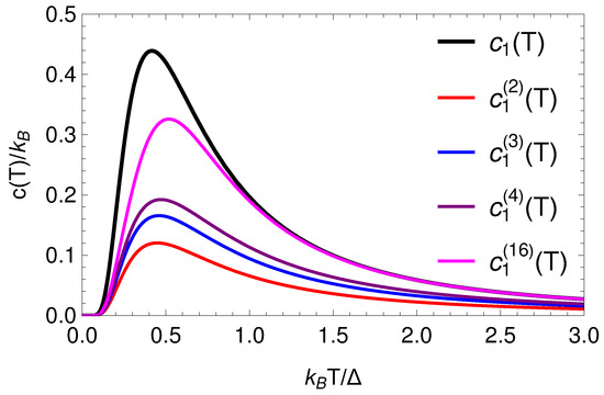 with the energy gap = . The specific heat = is shown in Figure 2. The maximum of as a function of T is known as the Schottky anomaly [10], a feature that is qualitatively different from the monotonous increase typical for continuum systems. It is due to the limited number of available states and is observed, e.g., in paramagnetic materials or materials with paramagnetic impurities.