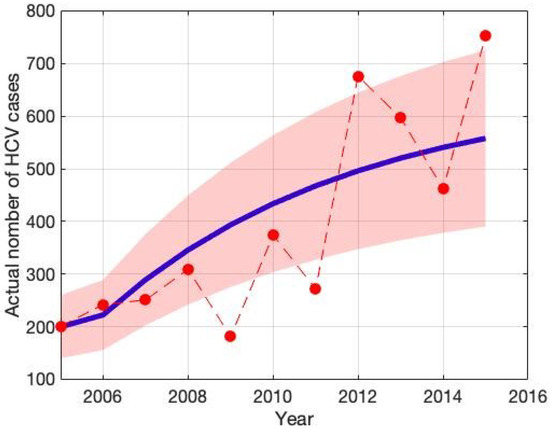 A critical factor influencing the spread of HCV is human-to-human transmission; thus, the transmission rate represents a key parameter for outbreak dynamics. To estimate this and related parameters, we analyzed HCV incidence data in Bangladesh from 2005 to 2015 [42]. Figure 2 illustrates the observed HCV incidence rates (red circle) alongside the model-fitted curve (solid blue line), with a 95% confidence interval (CI) represented by green-shaded boundaries. This graphical representation highlights the close alignment between observed data and the fitted model, providing evidence for the robustness and reliability of the parameter estimation approach.