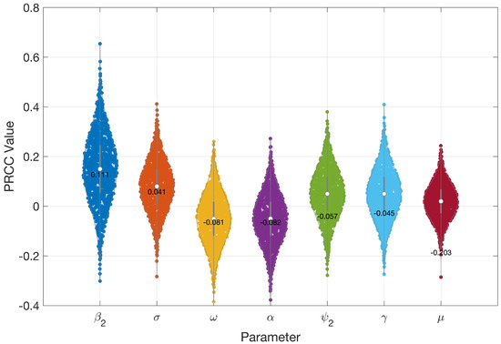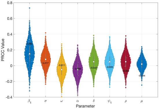Sensitivity analysis is a critical tool to identify the most influential parameters affecting model outcomes [31]. In this study, we conducted a sensitivity analysis to determine which parameters have the greatest impact on the model outputs. This process highlights the key drivers of infection dynamics and offers valuable insights for effective outbreak control. We employ Latin Hypercube Sampling (LHS), a robust and efficient sampling-based technique, combined with Partial Rank Correlation Coefficient (PRCC) analysis, a global sensitivity method [31]. PRCC specifically assesses the monotonic relationships between input parameters and model outputs by analyzing residuals from linear regression models. This residual-based approach is particularly well-suited for nonlinear systems, allowing for a more reliable evaluation of parameter influence.