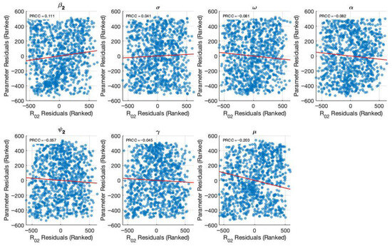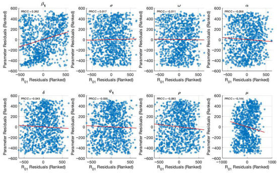 Figure 5 and Figure 6 present the results of the sensitivity analysis of the basic reproduction number () using Latin Hypercube Sampling (LHS) and Partial Rank Correlation Coefficients (PRCC). This analysis evaluates the impact of key epidemiological parameters on . The PRCC results were further visualized using a violin plot (Figure 5). Each parameter was ranked based on its relative impact on The result of these analyses indicates that the transmission rate () exhibits the highest PRCC value (+0.111), indicating a strong positive influence on . Two primary visual outputs were generated: the PRCC violin plot (Figure 5) and the residuals plot (Figure 6). The residuals plot in Figure 6 illustrates the partial dependency between each parameter and while accounting for the correlations with other variables. Each subplot displays the correlation between the residuals of the ranked input parameter (y-axis) and the residuals of the ranked values (x-axis). The red regression line in each subplot indicates the strength and direction of the partial correlation, where the slope reflects whether the parameter positively or negatively influences . Parameters with positive slopes—such as and —are identified as transmission-enhancing factors, while those with negative slopes—such as and—act as transmission-suppressing factors.