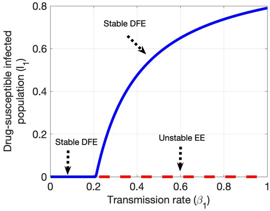 For the drug-susceptible endemic equilibrium, we consider the infected compartment (I2) is zero i.e., I2 = R = 0 and I1 ≠ 0. Thus, the mathematical expression for the drug-susceptible endemic equilibrium is given bellow: