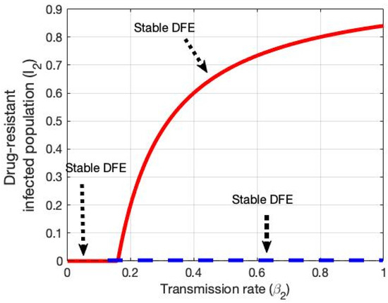 For the drug-resistant strain endemic equilibrium, we consider the primary infected compartment (I1) is zero i.e., I1 = R = 0 and I2 ≠ 0. Thus, the mathematical expression for the drug-resistant strain endemic equilibrium is given bellow: