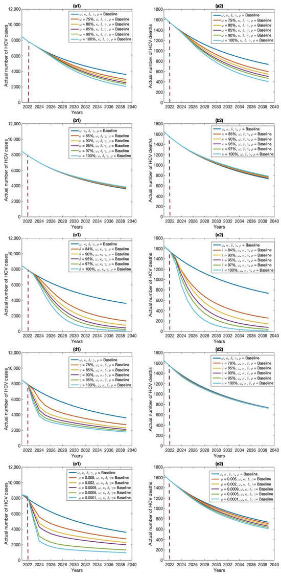 Effects of five individual intervention strategies on HCV cases (a1–e1) and deaths (a2–e2): (a) first-dose vaccination, (b) second-dose vaccination, (c) treatment of drug-susceptible cases, (d) treatment of drug-resistant cases, and (e) amplification rate.