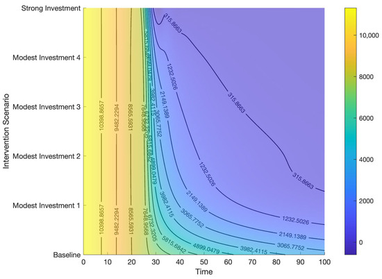 Contour plot representing the effects of combined control strategies on HCV deaths.