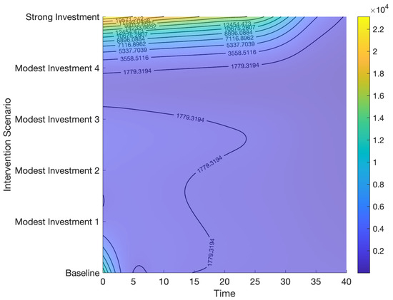 Contour plot representing the effects of combined control strategies on HCV cases.