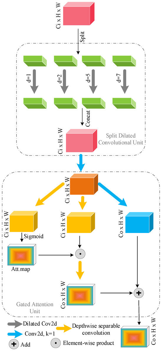 where, the corresponding branch’s convolutional filters and bias terms are denoted by and , respectively, with kernel size . The convolution operation is denoted by . The rectified linear unit activation function introducing non-linearity is referred to as . An aggregated multi-scale feature representation is generated by concatenating along the channel dimensions the feature maps generated by the three branches: