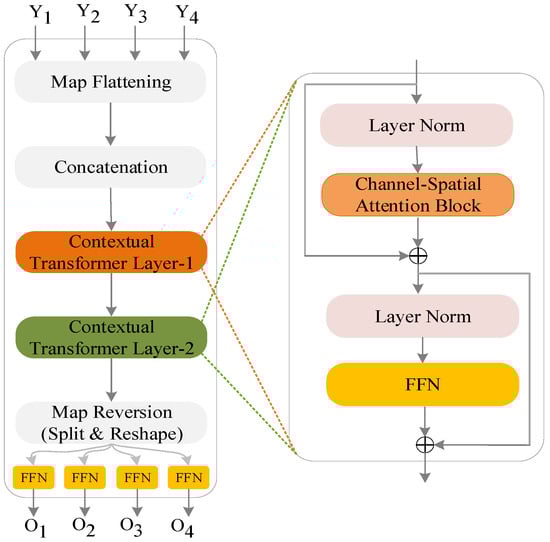 To maintain contextual consistency within multiple dimensions simultaneously, BTC analyzes temporal and spatial data. As illustrated in Figure 4, the two parallel transformer branches-the one for the time dimension and the other for the space dimension-provide cross-attention in which the two interacting branches may enhance feature embeddings. After MGTP, the input feature map is shown as .