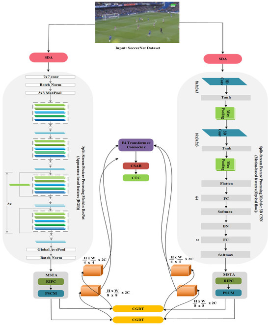 Soccer is one of the most widely played and analysed sports worldwide, with millions of fans, analysts, and coaches relying on video-based assessments to evaluate player performance, team strategies, and game dynamics [1]. The increasing availability of match footage has driven significant interest in SAR a field focused on the automatic identification and classification of player actions such as passing, dribbling, shooting, and tackling from video sequences. Accurate SAR has numerous applications, including automated performance assessment, tactical analysis, player behaviour modelling, injury prevention, and highlight generation. The recent advancements in computer vision and deep learning have substantially improved SAR capabilities, enabling efficient analysis of vast amounts of match footage with minimal manual intervention [2,3]. Despite these advancements, most existing SAR models focus on coarse-grained classification, where actions are categorized into broad classes such as “attacking”, “defending”, or “goalkeeping”. While useful for general analysis, this level of classification lacks the granularity required for precise tactical evaluation. In contrast, fine-grained action recognition, which differentiates between subtle variations in player movements (e.g., short pass vs. long pass, chip shot vs. volley), remains an underexplored and challenging domain. Fine-grained SAR is crucial for detailed player evaluation, opponent analysis, and strategic decision-making, as it enables analysts and teams to assess individual and collective behaviours with greater accuracy. Achieving reliable fine-grained recognition is complex due to multiple factors, including frequent occlusions, complex player interactions, background clutter, and variations in camera angles [4,5]. Unlike sports such as basketball, where player positioning and court dimensions are relatively fixed, soccer involves highly dynamic movements across a large playing field, making it difficult for conventional models to capture both spatial and temporal dependencies effectively. Additionally, player movements in soccer are often subtle and context-dependent, requiring SAR models to incorporate advanced multi-scale feature extraction and contextual learning techniques to improve recognition accuracy.