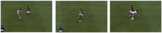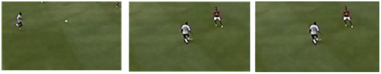 The exceptional performance of TAT-SARNet can be attributed to its ability to retain long-term action sequences (such as sustained buildup leading to a goal attempt) while, at the same time, recognizing short-term micro-actions (such as quick dribbling maneuvers). To prevent the model from overfitting on shorter sequences and enhance its generalizability to varying action durations, the CTC module ensures that frame-level predictions are averaged over time. Although MPT has excellent performance, TAT-SARNet surpasses it by maintaining greater consistency in long-term sequence prediction, as per the comparative analysis of rival models. Relative to other models, TAT-SARNet’s CTC module ensures a robust balance between long-term and short-term action dependencies to support more accuracy and recall. The model’s output represents the probability of an action occurring at a given timestamp, as shown in Figure 9. Figure 10 and Figure 11 show examples of true and false positive dribbling actions detected during the match between Team J (white shirt) and Team L (red shirt), occurring at 88 min and 12 s, and 74 min and 8 s, respectively.