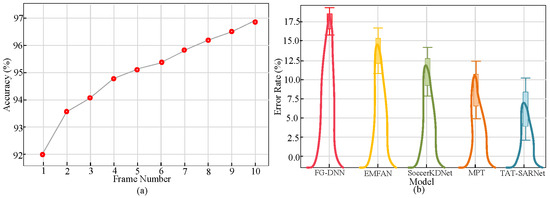 The temporal consistency graph in Figure 12a for fine-grained action classification further illustrates the robustness of the model by showing that TAT-SARNet maintains higher classification stability over a variety of time intervals. The method reduces rates of misclassification in complex scenarios by consistently upholding contextual links across multi-frame sequences. TAT-SARNet achieves the lowest error rates in all classes of actions, especially in concurrent action categories where temporal misalignments typically create higher numbers of false negatives, as per the distribution of the error rate plotted in Figure 12b.
