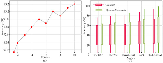 Further investigation indicates that while under occlusion and high-motion scenarios, error rates of comparison models increase considerably, peculiarly for players moving back and forth from offense to defense. The percentage of performance loss in each model is illustrated by Figure 13a, where TAT-SARNet shows a minimal loss of 4.8% under occlusion situations and 3.2% for dynamic movements, while other models register averages of 8–12%. Despite diminished player visibility, Figure 13b’s simulation frame for occlusion illustrates how TAT-SARNet preserves contextual information to properly classify actions.