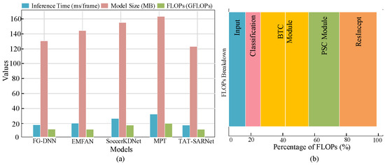 A bar chart illustrating the comparison of inference time, model size, and FLOPs between models is presented in Figure 14a to further investigate computing performance. TAT-SARNet’s reduced design, particularly the enhanced RIPC, is responsible for faster inference time and significantly fewer FLOPs. A layer-wise breakdown of FLOPs is visualized in Figure 14b, which demonstrates how TAT-SARNet minimizes computing cost by avoiding unnecessary operations at lower levels while preserving fine-grained action details.