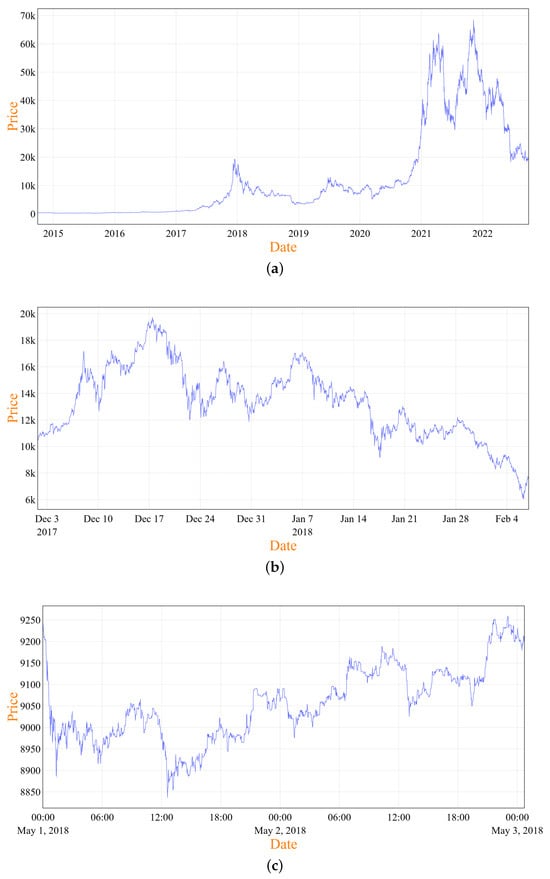 Historical price chart of Bitcoin across daily, hourly, and minutely timeframes. (a) Daily Timeframe: from 1 October 2014 to 1 October 2022. (b) Hourly Timeframe: from 1 December 2017 18:00 to 2 April 2018 13:00. (c) Minutely Timeframe: 1 May 2018 00:00 to 3 May 2018 00:42.