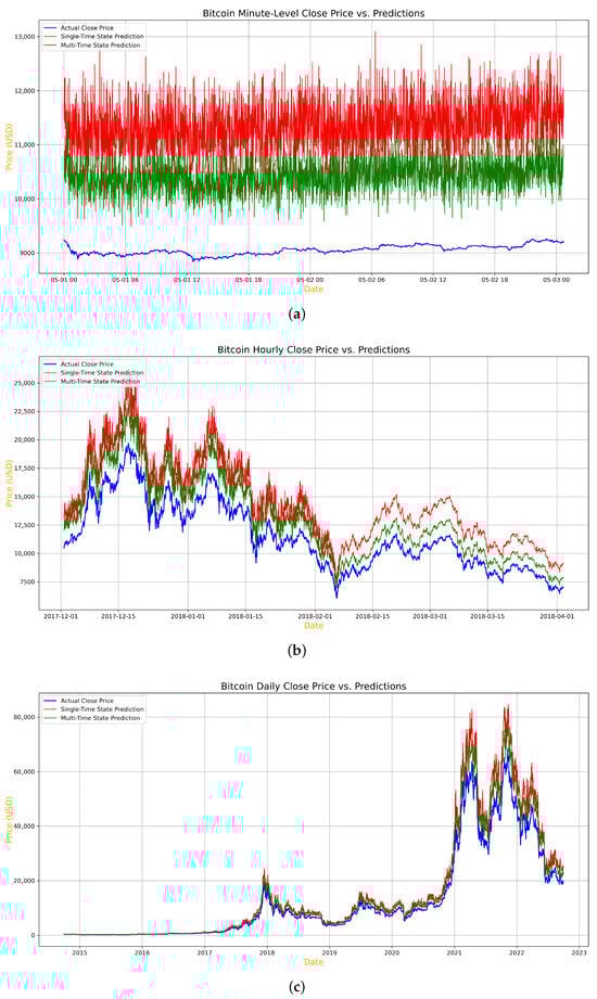This study presented a novel approach for predicting Bitcoin price changes by utilizing a DQN-based model with a multi-time state representation and a volatility-adjusted reward function. Given Bitcoin’s characteristic volatility, we aimed to develop a model that improves prediction accuracy and incorporates risk management to mitigate large prediction errors during volatile market periods. Our experiments, conducted across minute, hourly, and daily timeframes, demonstrated that the proposed multi-time state representation significantly enhances predictive performance compared to single-time representations. This suggests that capturing recent short-term price trends allows the model to better adapt to immediate market conditions, thereby improving prediction accuracy. The impact of window size () in the multi-time state representation is significant, as it balances the inclusion of recent price trends with the need to avoid introducing irrelevant data. Future work could investigate varying window sizes, such as  or , to determine if additional temporal information further enhances the model’s predictive power.