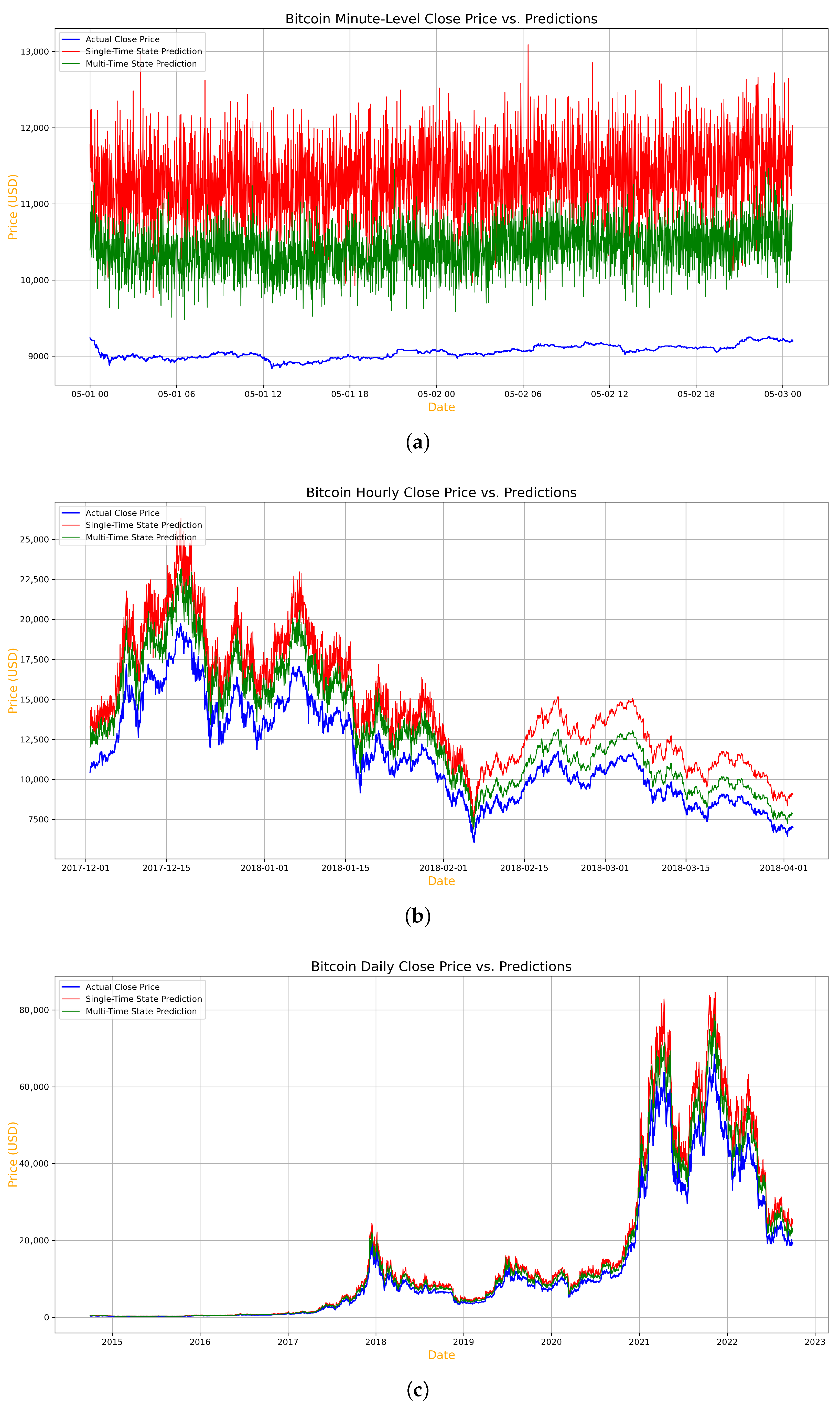 Figure 3 provides a visual representation of the actual and predicted prices across the minutely, hourly, and daily timeframes, respectively, allowing us to further examine these results.