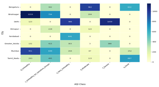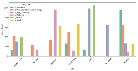 Figure 5 illustrates the number of images available for each of the six AQI classes across the different cities in the dataset. shows the distribution of image samples across different cities and AQI classes. represents the seven cities, with the number of images available for each AQI class. corresponds to a specific AQI class: a_Good for a Low pollution, which is safe air quality. b_Moderate—is Acceptable air quality but pose risks for sensitive individuals.c_Unhealthy for Sensitive Groups which carry Risk increases for vulnerable groups including children, elderly, patients.d_Unhealthy—Hazardous for the general population. e_Very Unhealthy is Health warnings of emergency conditions and f_Severe is Extremely hazardous, emergency-level pollution. also illustrate that Delhi has the largest share of images in the Very Unhealthy and Severe categories, indicating critical air pollution. This distribution highlights significant city-level differences in AQI classes, emphasizing the imbalance of pollution levels across all cities and motivating the need for robust classification models.