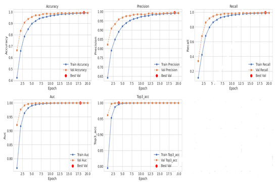 Vision-AQ model trained for 20 iterations. We monitored the performance metrics which illustrated in the training history of model and plots in Figure 7, which show the Accuracy, Precision, Recall, AUC, and Top-3 Accuracy for both the training and testing sets. The red marker indicates the point of best performance on the testing set.