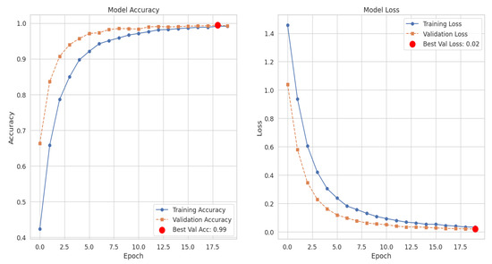 Figure 8 Vision-AQ achieves the best testing accuracy of 99% and reaches the best testing loss of 0.02. The convergence of the curves demonstrates effective learning and good generalization. testing set, comprising 2448 image-tabular pairs in the test data set. The detailed per-class performance is given in the Classification Report in Table 3 of the Vision-AQ model.