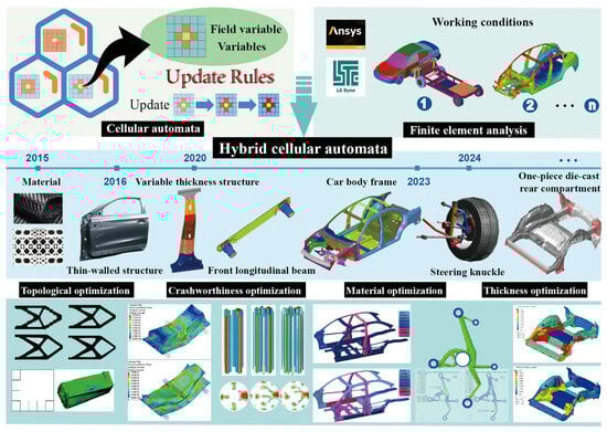 - Mozumder, C. Topometry Optimization of Sheet Metal Structures for Crashworthiness Design Using Hybrid Cellular Automata. Int. J. Veh. Des. 2010, 60, 100–120. [Google Scholar] [CrossRef]