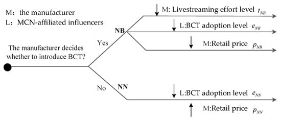 In the NB scenario, the manufacturer chooses to adopt BCT without seeking financing, assuming that its initial capital satisfies the condition: . The sequence of decisions in this scenario (as shown in Figure 1) is characterized by a three-stage game: in Stage I, the manufacturer decides the BCT adoption level ; in Stage II, the influencer affiliated with the MCN determines their livestreaming effort level ; in Stage III, the manufacturer finally sets the product retail price . Within the framework of BCT adoption, two mechanisms come into effect: first, BCT enables quality signal transmission, allowing market participants to form a particular quality perception (upgrading from the prior expected quality perception to a determinate quality perception ); second, the application of BCT generates an independent demand expansion effect . Accordingly, the demand function in the NB scenario can be expressed as: