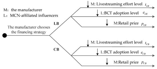 As evident from Table 1, Cui, Gaur, and Liu [] and Caliskan, Idug, Gligor, and Hong [] have factored BCT into their research. Liu, Zhou, Hu, and Zhong [] and Xu, Chen, Hou, Cheng, Yu, and Zhou [] delved into the adoption and application of BCT within LSCs. However, they did not explore which financing strategies manufacturers should adopt or apply BCT when facing financial limitations. Similarly, Mandal, Basu, Choi, and Rath [] and Tang, Xu, Chen, and Zhang [] scrutinized loan financing strategies for manufacturers operating under limitations on finances. Still, the outcomes of cost-sharing and BCT were not taken into account. Moreover, while Niu, Chao, Liu, Zhang, and Luo [] and Cao, He, Liu, Huang, and Zhang [] considered cost-sharing, they overlooked the other factors. Drawing on these insights and aligning with real-world practices, we have integrated livestreaming, BCT, loan financing, and investment cost-sharing financing into our model. In current financing practice, these two financing models are not only widely applied but also highly representative. Incorporating them into the model helps clarify the core strategic interactions between the manufacturer and the MCN following the adoption of BCT. Furthermore, focusing on MCN-involved financing approaches closely aligns with the emerging trend of influence-driven credit mechanisms in the livestreaming e-commerce sector, highlighting strong contextual relevance and giving this study distinct novelty. We investigate whether financially constrained manufacturers in LSCs should adopt BCT, which financing strategy is optimal, and how this choice affects MCN profitability. To our knowledge, this specific topic has not been covered in existing literature. Our research extends the knowledge on BCT adoption and offers practical insights for businesses seeking financing solutions under capital constraints.