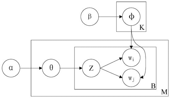In this study, the GloVe model is used to train pre-processed Weibo corpus data, generating word embeddings that more accurately reflect global semantics. These enhanced embeddings improve the efficiency and accuracy of the Biterm Topic Model (BTM). The BTM itself is an enhancement of the Latent Dirichlet Allocation (LDA) model, specifically designed to address LDA’s shortcomings in short-text scenarios. By constructing co-occurrence word pairs across the entire corpus, the BTM effectively addresses the issue of data sparsity commonly encountered in topic modeling of short texts. A schematic diagram of the BTM topic model is shown as Figure 2 below.